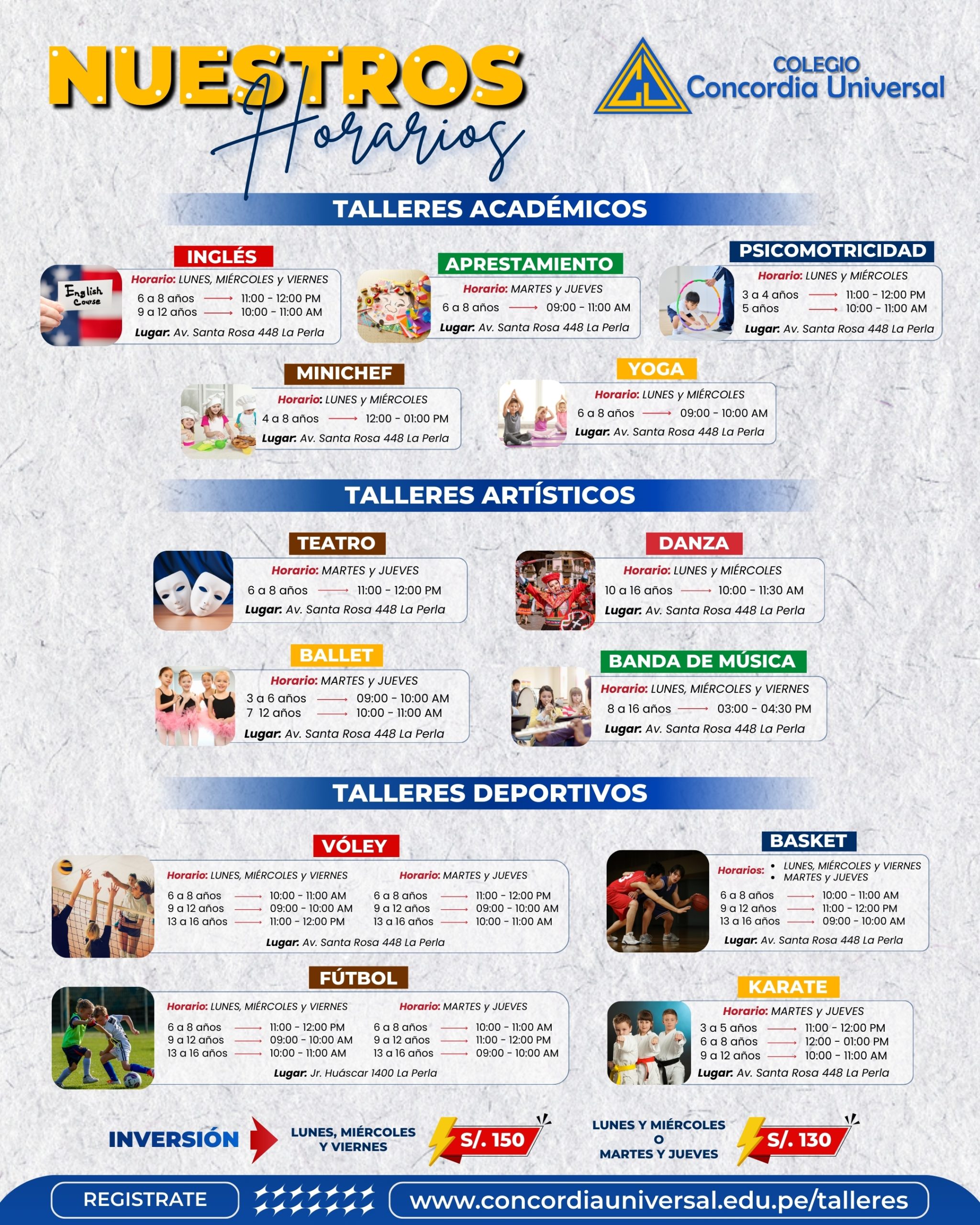Nuestra academia deportiva y de danzas tiene como objeto, ofrecer cursos y talleres al público en general con una duración mensual y a un costo económico, que permita desarrollar las habilidades físicas, motoras y artísticas de los alumnos; contamos con docentes calificados y de alta experiencia y una infraestructura moderna para el desarrollo de cada taller. Para matricularse los interesados deberán reservar sus vacantes en línea.